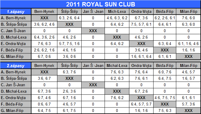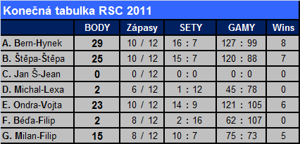 Ročník 2011Konečná tabulkaDatum & ukončení aktuálního ročníku: 23.2.2012 23:59 hod Konečný stav tabulky k: 23.2.2012 23:59 hodLegenda: dvojice Jan Š / Jan J celoroční turnaj 2011 skrečovala a tedy výsledky jejich zápasů nejsou nijak zohledněny ve výsledcích ostatních dvojic